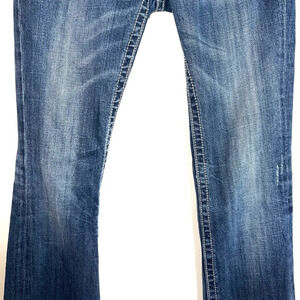 Miss Me Boot cut dark wash jeans. In excellent condition! Low rise. Double button front closure. Boot cut. Fitted in the thigh & kicks out below the knee. 32” inseam. Functional front & back pockets. Silver rhinestones along the back waist & pockets. Dark wash with whiskering. Waist size 28.