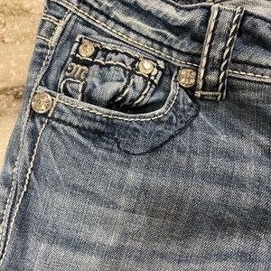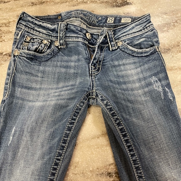 Miss Me Bootcut size 25, length hemmed to 28”. Small fraying of stitch on right front pocket. (Pictured)