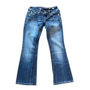 This pair of Miss Me bootcut jeans boasts a medium wash denim look, featuring stylishly embellished back pockets with detailed stitching. Size 26.