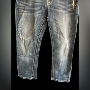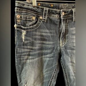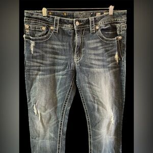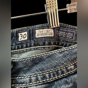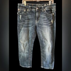 Used Miss Me Boyfriend Capri Jeans size 30, color blue, with a beautiful back pocket design. In good condition from a smoke free home