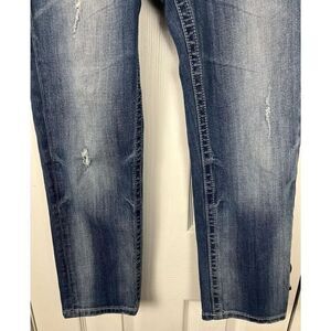 These jeans have a mid-rise and a 24-inch inseam, making them a great choice for women who want to show off their unique style. The distressed details add a touch of edginess to your outfit, and the dark wash color complements any outfit. These jeans are machine washable and are available in size 26 with a waist size of 30 inches.