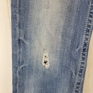 Has small hole in one knee and some general wear, mid to low rise denim, straight leg, slightly cropped.