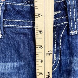 In great preowned condition. Some wear throughout. Actual item for sale photographed, please see photos for details, flaws and measurements. Miss Me Capri Jeans Women's Size 26 Blue Denim White Stitch Rhinestone JP6048P5