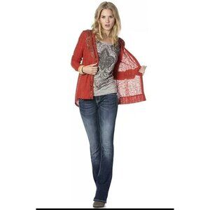 This Miss Me cardigan in rust color offers an eye-catching design with its intricate embellishments. It features a button-up front and a unique mixed media back. Wear layered as a cardigan or as a top alone.