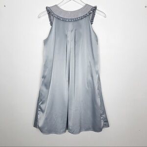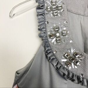 Pretty Miss Me Collection silver fully lined swing dress with jeweled beads and ruffles around the neckline. This is a perfect party dress for summer weddings or holiday parties. Excellent used condition. Size S.