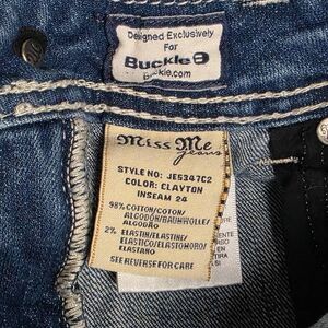 Pre-owned Miss Me women’s cropped jeans, size 29, style JE5347C2, color Clayton, inseam 24. Designed exclusively for Buckle. Medium wash denim with fading, light distressing, and whiskering. Features signature Miss Me Fleur-de-Lis embellished back pockets with rhinestone details, contrast stitching, and silver hardware. Classic 5-pocket design, zip fly, and logo button closure. 98% cotton, 2% elastane for stretch comfort. Excellent used condition, no flaws.