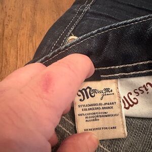 Stylish boot cut jeans by Miss Me. Dark blue denim with classic stitching. Perfect for any occasion.