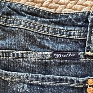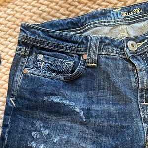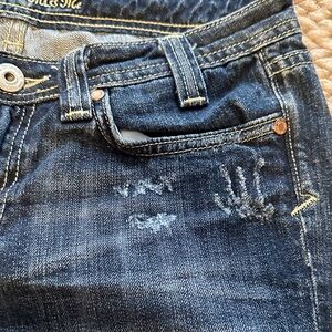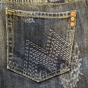 Stylish boot cut jeans with unique pocket design. Deep blue color. Ideal for any occasion. Length is 27 see picts