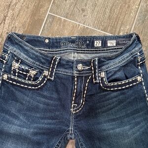 Chic dark blue flare jeans. Features stylish stitching. Perfect for a trendy look.