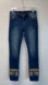 Ankle skinny jean done in a medium-dark wash, detailed with embroidered design above cuffed hem. Has a mid-rise, fading, whickering, contrast stitching.