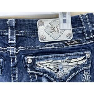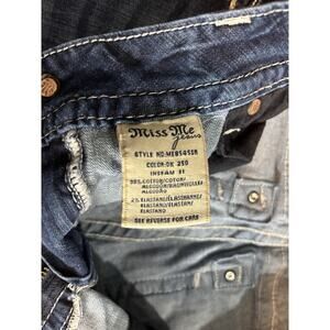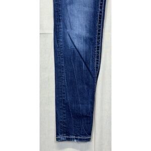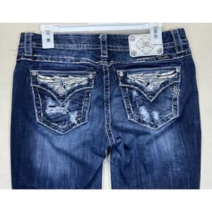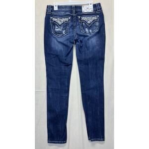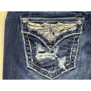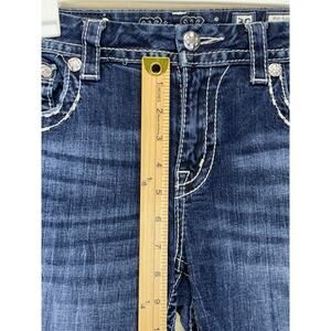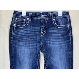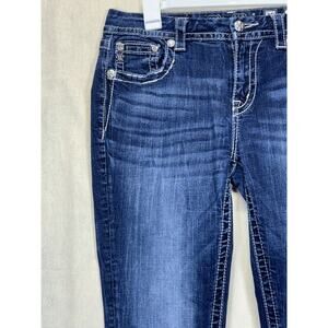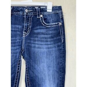 Stylish straight leg jeans. Dark blue wash. Classic five-pocket design. Contrast stitching detail.