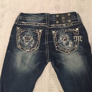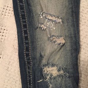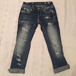 Miss Me denim cropped capris size 24. Lowrise. Slim fit. Diamond studded destruction. Barely worn.