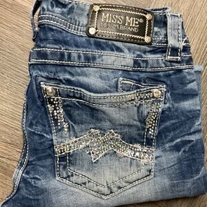 Keywords: Miss Me, Women's Denim Shorts, Size 28, Bermuda Shorts, Blue Denim, Rhinestone Embellished, Bling Shorts, Embroidered Pockets, Y2K Style, Festival Outfit, Clubwear, Western Chic, Premium Denim, Retro Vibes, Rodeo Style, Casual Summer Shorts, Designer Shorts
