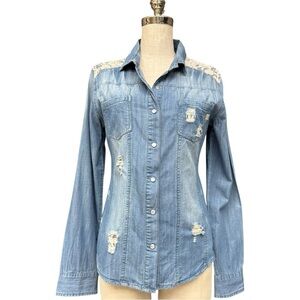 Miss Me Distressed Denim Western Shirt with Lace Detail, Women’s Medium