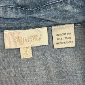 vintage denim shirt, western lace shirt, miss me lace top, distressed button-up, lace yoke blouse, women’s medium denim, boho country style, cowgirl chic, spring western wear, rodeo shirt, festival denim shirt, vintage inspired blouse, feminine western top, lace trim denim, rustic western fashion