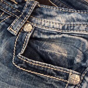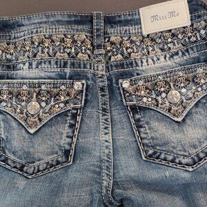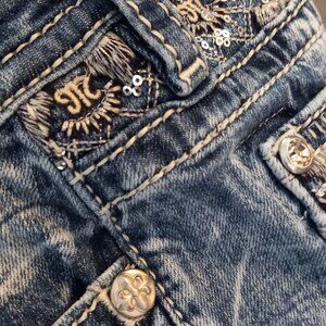 Miss Me distressed blue wash with intricate white stitching and rhinstones embellishments on pockets -
