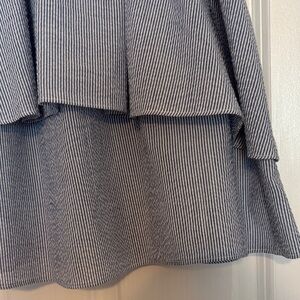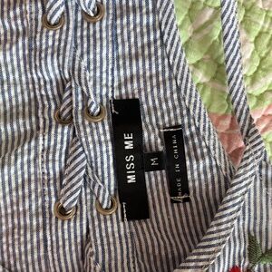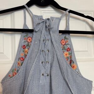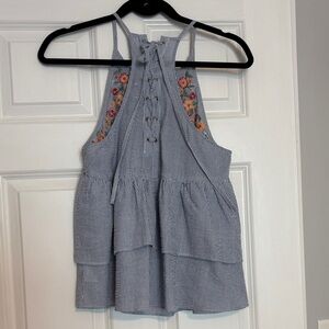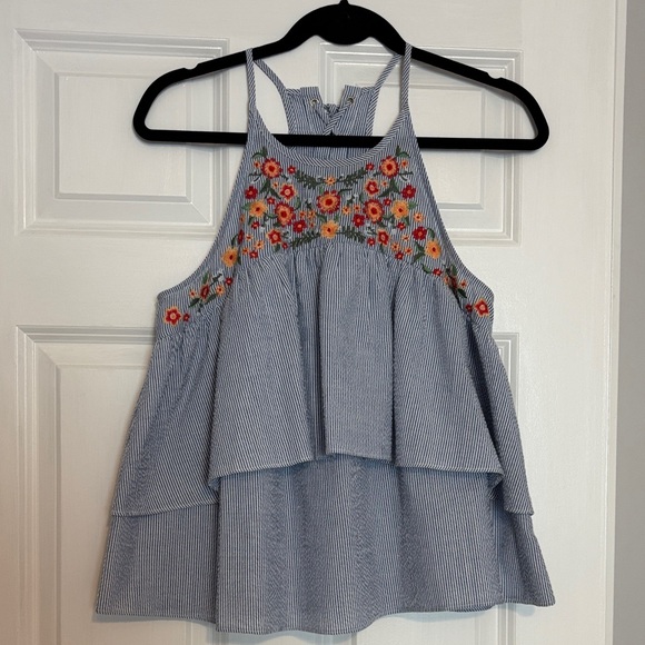 Light blue and white striped halter tank with colorful floral embroidery across the chest. Features tiered ruffle layers for a breezy, feminine look. Comfortable sleeveless design perfect for warm-weather styling. Brand is Miss Me, excellent condition, only worn a few times and hand washed in cold water, hung to dry.
