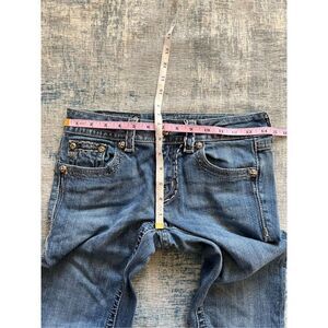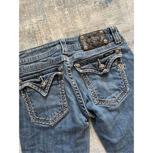 Medium blue skinny jeans from Miss Me. Whiskering and fading, zip fly, classic 5 pocket styling. Rhinestone and decorative stud embellishments. Miss Me signature M embroidered on back left pocket, leather logo patch on back waistband. Button flap back pockets. Excellent condition.