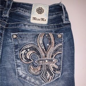 Chic boot cut jeans by Miss Me. Features heavily detailed embellishments on back pockets. Heavy lighting on the thighs. Ideal for casual wear. Excellent preowned condition with no missing gems, no holes or stains and smoke free! I would note that the back leather brand patch has some blue shadowing/staining from laundering.