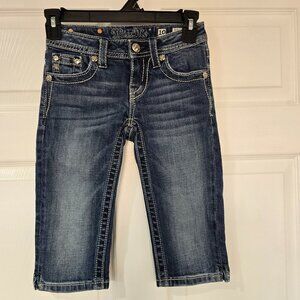 Excellent condition girl's Miss Me denim capri pants (JK7047P). They have rhinestone and silver embellishments. Fabric is cotton/elastane blend and size is 10.