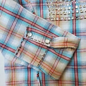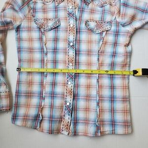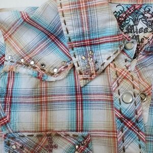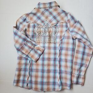 Miss Me Girls Plaid Western Shirt with Bedazzled Pearl Snap Size L.