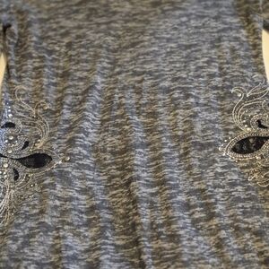 Chic gray blouse with black embellishments. Features intricate detailing. Ideal for stylish occasions.