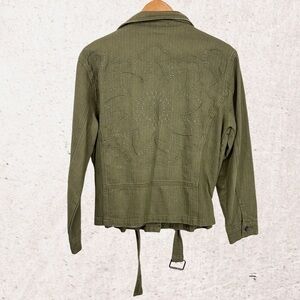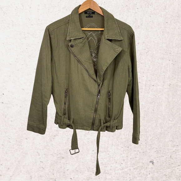 This Miss Me utility jacket in a rich green hue features an asymmetrical zipper closure and a versatile adjustable waist for a customizable fit. Crafted from a soft, textured fabric, it offers both style and comfort, making it a perfect addition to your outerwear collection.