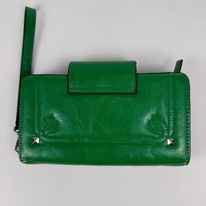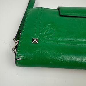 Condition: There are several areas of this wristlet where the green material has scratched and the white underside is visible. These are all on the outside of the wallet, including at the corners where the material is coming off from normal wear over time. Please see photos.