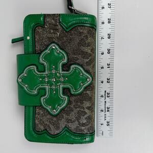 Miss Me Green Wristlet Wallet Logo Sparkling Bling Rhinestone Green Leopard