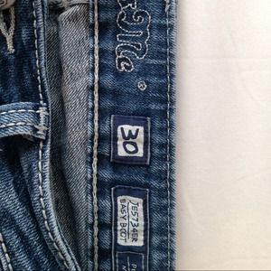 Super cute Miss Me Jeans. Mixed hardware, easy boot fit, 31" inseam. Little bit of fraying on left leg