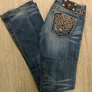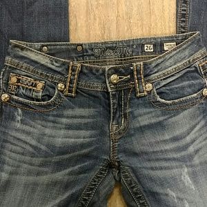 Distressed pair of Miss Me jeans with bedazzled pockets! Excellent used condition; normal wear at bottoms as pictured in 4th photo. Size 26, boot cut. No stains! Ask any questions you may have!