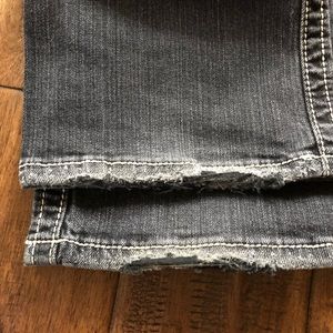 Size 26. Inseam is 35. These are like a black color not blue. There is one stone missing (small) on back of right pocket. Mild wear on very bottoms see last pic.