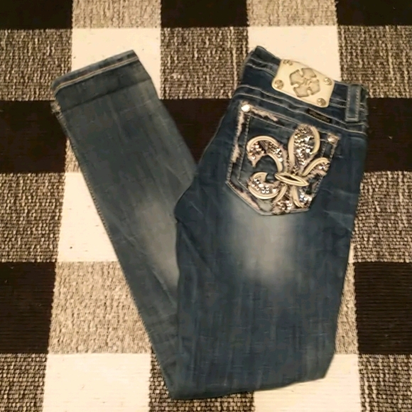 Miss Me Jeans. Only worn twice. Skinny leg. Inseam is 30 Tiny pink spot in this pic. I will try and remove it. I will update if I'm successful. Update: Yes I got it out. No more pink spot! ☺️