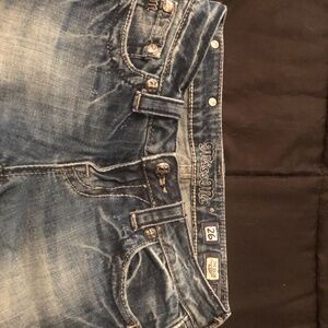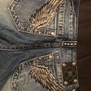 Size 26 Miss Me Jeans with Wings, glue stains on one leg that are not very noticeable. Great condition otherwise.