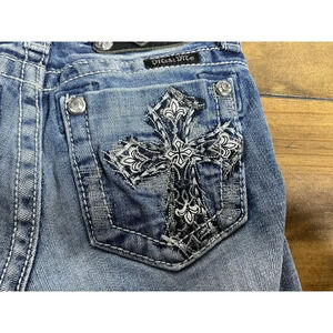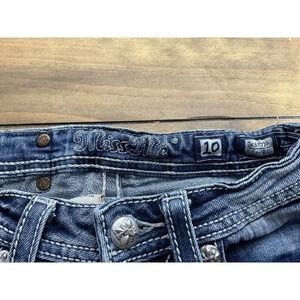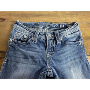 Elevate your little girl's wardrobe with these trendy Miss Me capri jeans. The medium wash denim with light fading is accented with stylish cross-stitching and embroidered accents for a unique touch. The low-rise fit and regular cut make them perfect for casual occasions, while the zip closure and pockets add functional flair. Made from a comfortable blend of spandex, cotton, and cotton blend, these jeans are suitable for all seasons. These jeans are a must-have for girls who love to rock a trendy and stylish look.pre owned good condition we ship fast measurements are in the pictures