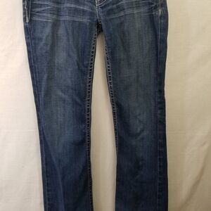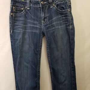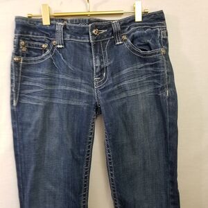 No rips, stains or off odors. The product is a pair of Miss Me Jeans in a boot cut, low rise style with stretch fabric in a size 29 (30x30). The jeans feature rhinestone, embroidered, and logo accents, a 5-pocket design, and a regular fit. They are machine washable and made of a cotton blend denim fabric. The jeans have a solid blue color and are designed for all seasons. The brand, Miss Me, is known for its rock, cowboy, and Southwestern theme, making these jeans a stylish and versatile addition to any woman's wardrobe.