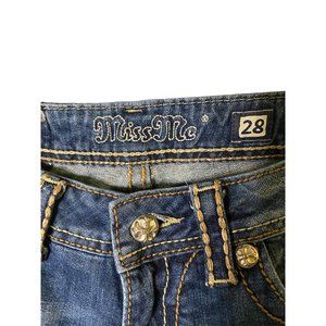 Miss Me Jeans in a medium wash and low rise, boot cut style, adorned with studs and gems. Size 28. A perfect blend of comfort and style.