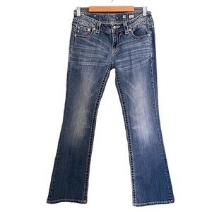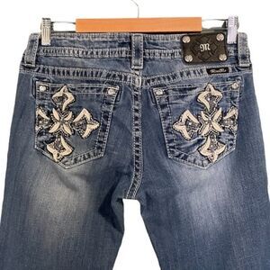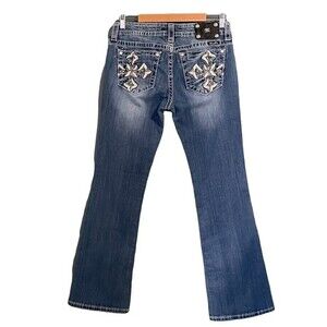 Miss Me Jeans Signature Boot Medium Wash Crystal Leather Cross Pocket Size 29