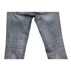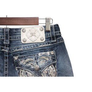 The Miss Me Jeans in size 27 feature a mid rise easy crop design, perfect for a rodeo or western-themed event. These embellished and embroidered jeans in light blue color are made of a comfortable blend of spandex and cotton. The jeans have a zip and button closure, a 5-pocket design, and are accented with rhinestones and intricate embroidery, adding a touch of flair to your outfit. The cropped style and stretch fabric make them ideal for the summer, fall, and spring seasons, catering to a trendy and adventurous look.