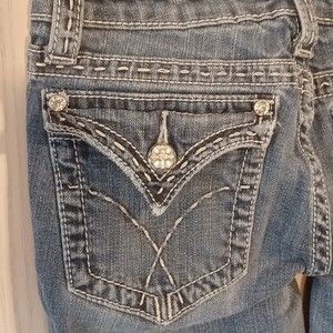 Elevate your denim game with these exquisite Miss Me jeans in Size 28. The low-rise waist ensures a modern fit, while the 30W x 30L measurements guarantee a tailored look. The classic boot cut leg not only lengthens your silhouette but also accommodates your favorite footwear effortlessly. Adorned with tasteful bedazzled accents, these jeans effortlessly fuse elegance with edginess, making them a versatile choice for both casual and semi-formal occasions. Whether you're strolling down the street or hitting the town, these jeans promise to be your go-to fashion statement, offering a unique blend of comfort, style, and personality.