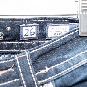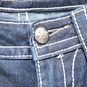 Hello cutest jeans ever! These MISS ME dark wash jeans are a size 26 and feature Jeweled Snowflake Stars on the tushy. Signature Boot Cut Western Flare. These jeans are sure to catch everyone's eye! Excellent pre-owned condition!