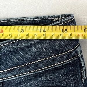 Pay attention to measurements in photos. The product is a Miss Me Jeans in size 30x32, featuring a bootcut style with sequined details for a touch of bling. The dark wash denim fabric gives it a medium wash, while the cotton blend material ensures comfort. With a low rise and zip/button closure, these jeans are designed for a regular fit and come in a classic blue color. Perfect for those who love the Western, rock, Y2k, and cowboy themes, these jeans also have a 5-pocket design for added functionality.