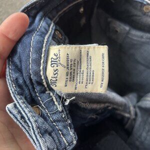Miss Me “M” logo metal patch on the back waistband with signature fleur-de-lis cross
