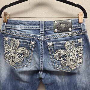 Features: Embellished back pockets with fleur-de-lis design; rhinestone/sequin accents; heavy contrast stitching; silver-tone logo buttons and rivets; leather Miss Me patch; five-pocket construction; zip fly with button closure; bootcut leg