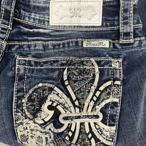 Miss Me Women's Denim Jeans. Blue in color. Dark denim wash. Tagged size 28x35 (6). These women's Miss Me jeans feature a five pocket design, embellished rear pockets with lace. leather and rhinestone fleur di lis, a boot cut leg and a low to mid rise fit. Style number ME8847BX. In preowned condition with minimal signs of wear.