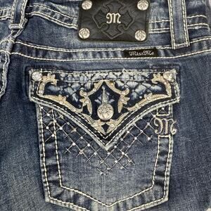 Miss Me Women's Denim Jeans. Blue in color. Medium denim wash. Tagged size 29 (8). These women's Miss Me jeans feature a five pocket design, embroidered and rhinestone rear pockets and hips, a boot cut leg and a mid rise fit. These jeans have a modified hem (see photos) see approximate measurements for inseam. Style number JP5827B2. In preowned condition with minimal signs of wear.