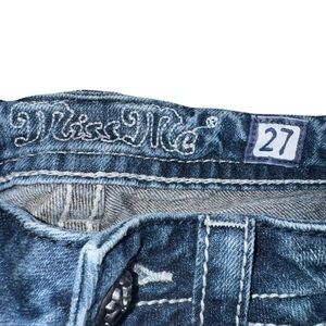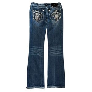 The image shows Miss Me jeans, a brand known for its distinctive embellished back pockets, which often feature designs like the Fleur De Lis.