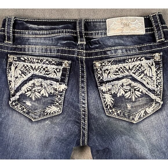 The product is a pair of Miss Me women's size 26 signature ankle skinny jeans in a dark blue denim color. These jeans feature a zip and button closure, low rise, and a 5-pocket design. They are made of a cotton blend fabric with added rhinestone and embroidered accents for a rock and grunge-inspired look. The jeans also offer stretch and are machine washable, making them a versatile and stylish option for any season.