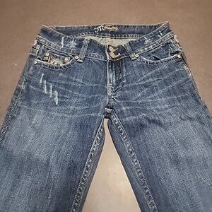 This listing is for a stylish pair of Miss Me women's jeans in size 27. These jeans feature a classic bootcut fit and a dark blue denim wash with intentional distressing for a vintage, worn-in look.
