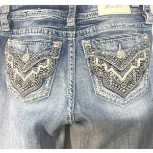 Keywords: Miss Me jeans, size 26 jeans, bootcut denim, rhinestone pockets, bling jeans, embellished jeans, Western style, heavy stitch denim, Miss Me bootcut, distressed jeans, designer denim, women’s jeans, Miss Me bling pockets, flare jeans, mid rise jeans